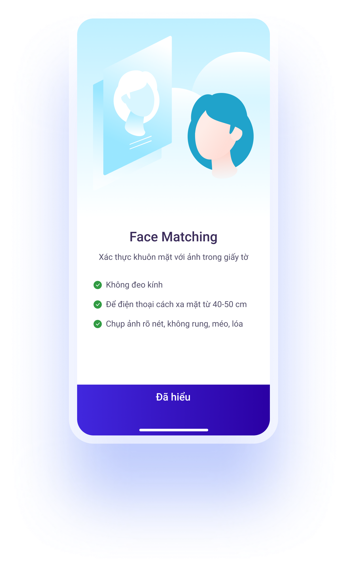 Quy trình Vega Fintech eKYC có tích hợp công nghệ Face Matching hiện đại. Giúp xác thực khuôn mặt khách hàng so với ảnh trong giấy tờ, kết hợp với công nghệ Liveness Detection nhằm xác minh có phải người thật hay không.